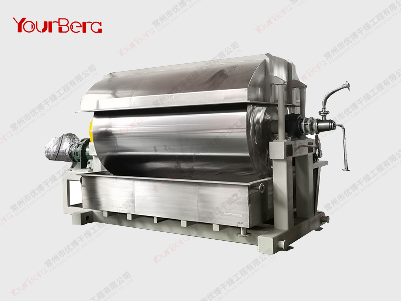 滾筒刮板干燥機是一種內加熱傳導型轉動連續干燥設備。旋轉的滾筒通過其下部料槽,粘附著一厚度的料膜,熱量通過管道輸送至滾筒內壁,傳導到滾筒外壁,再傳導給料膜,使料膜中的濕得到蒸發、脫濕、使含濕分的物料得到干燥。干燥好的物料被裝置在滾筒表面的刮刀鏟離滾筒,到置于刮刀下方的螺旋輸送器,通過螺旋輸送器將干物料···
